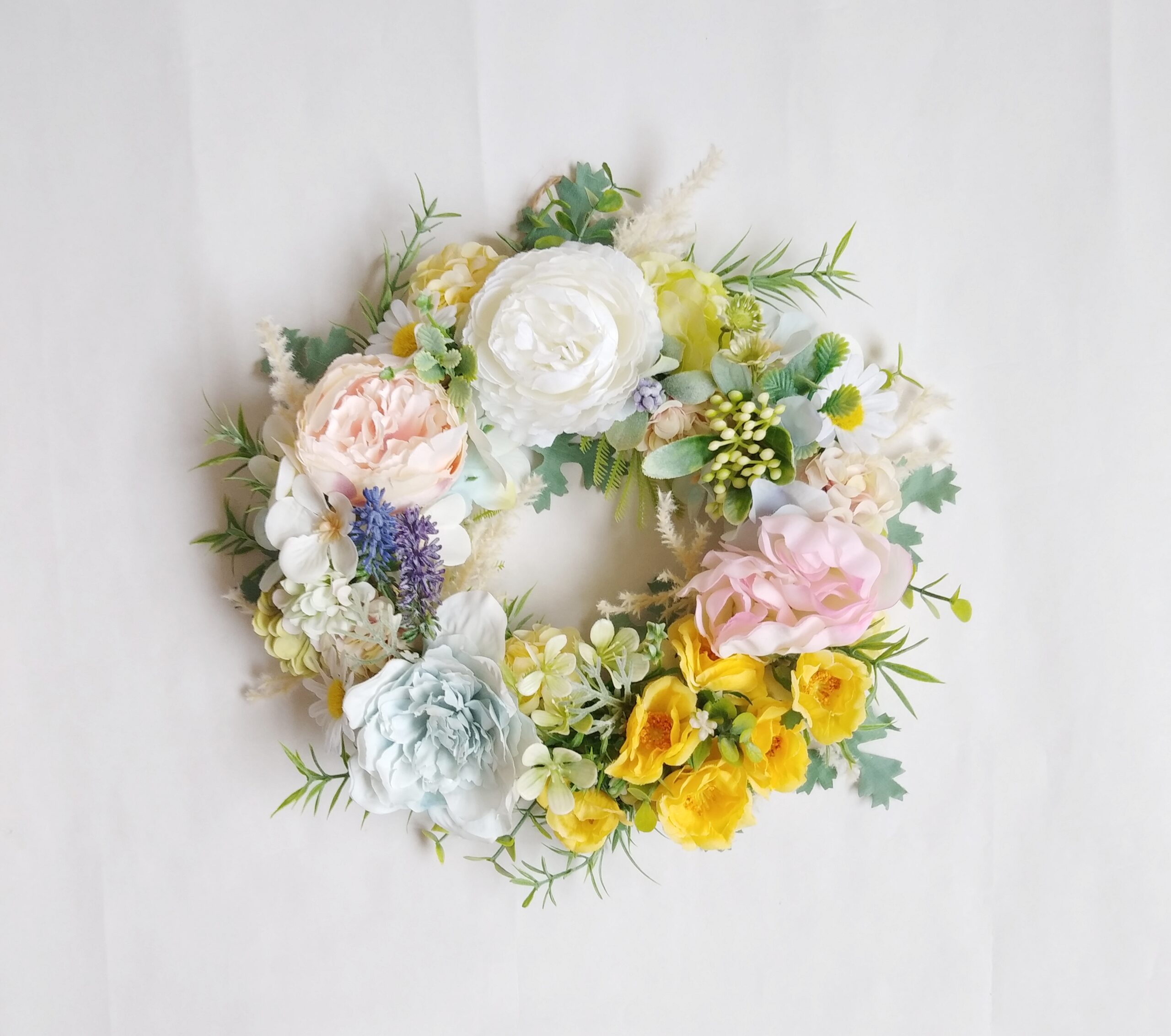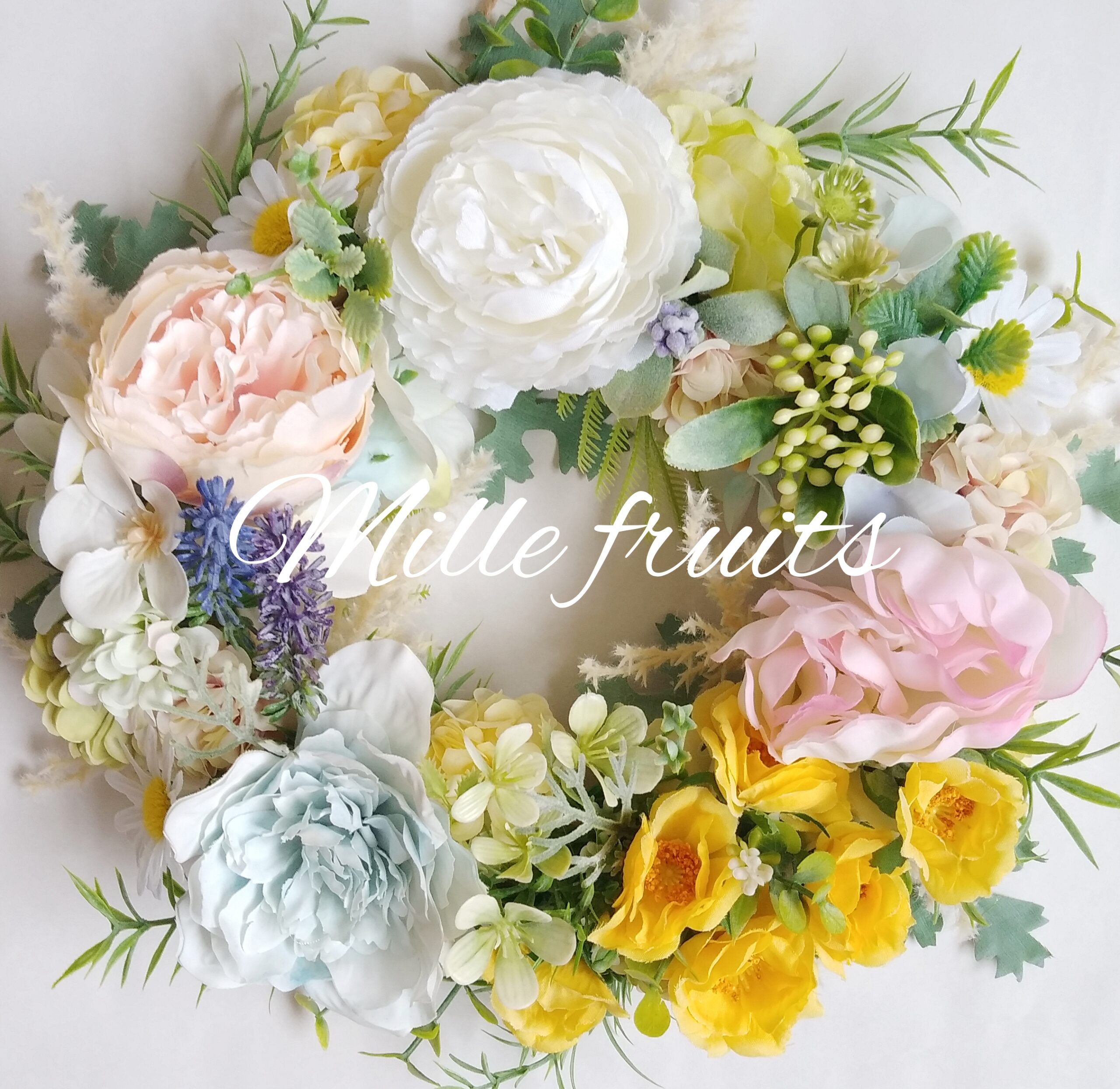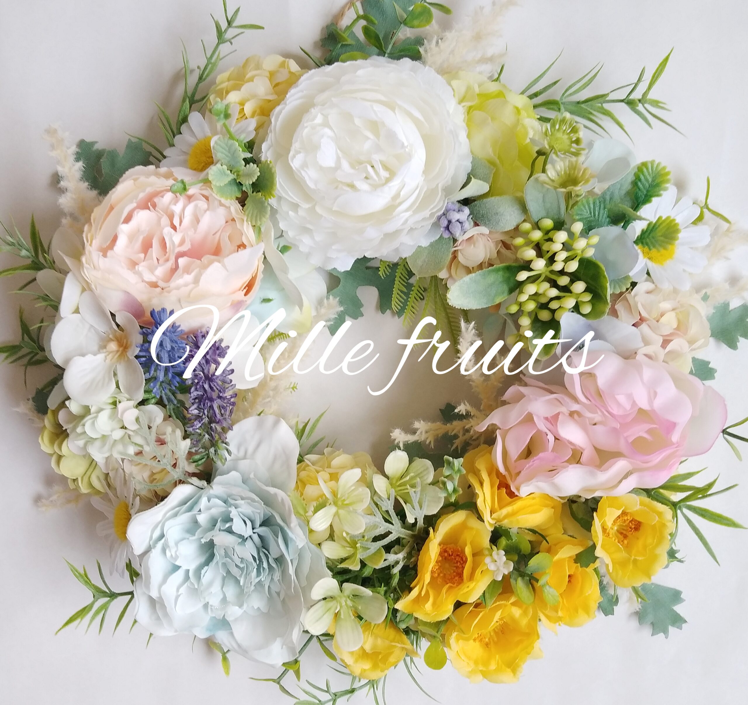 - こちらのリースは、アーティフィシャルフラワー(造花)でお作りしています。水やりをしなくてOK、枯れることもありません。